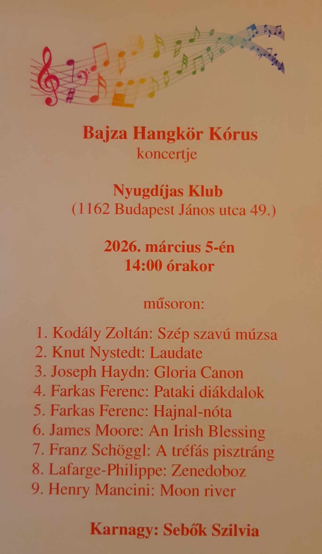 A Bajza Hang-kör Kórus 2024. április 20-án a 18 órai mise után hangversenyt ad